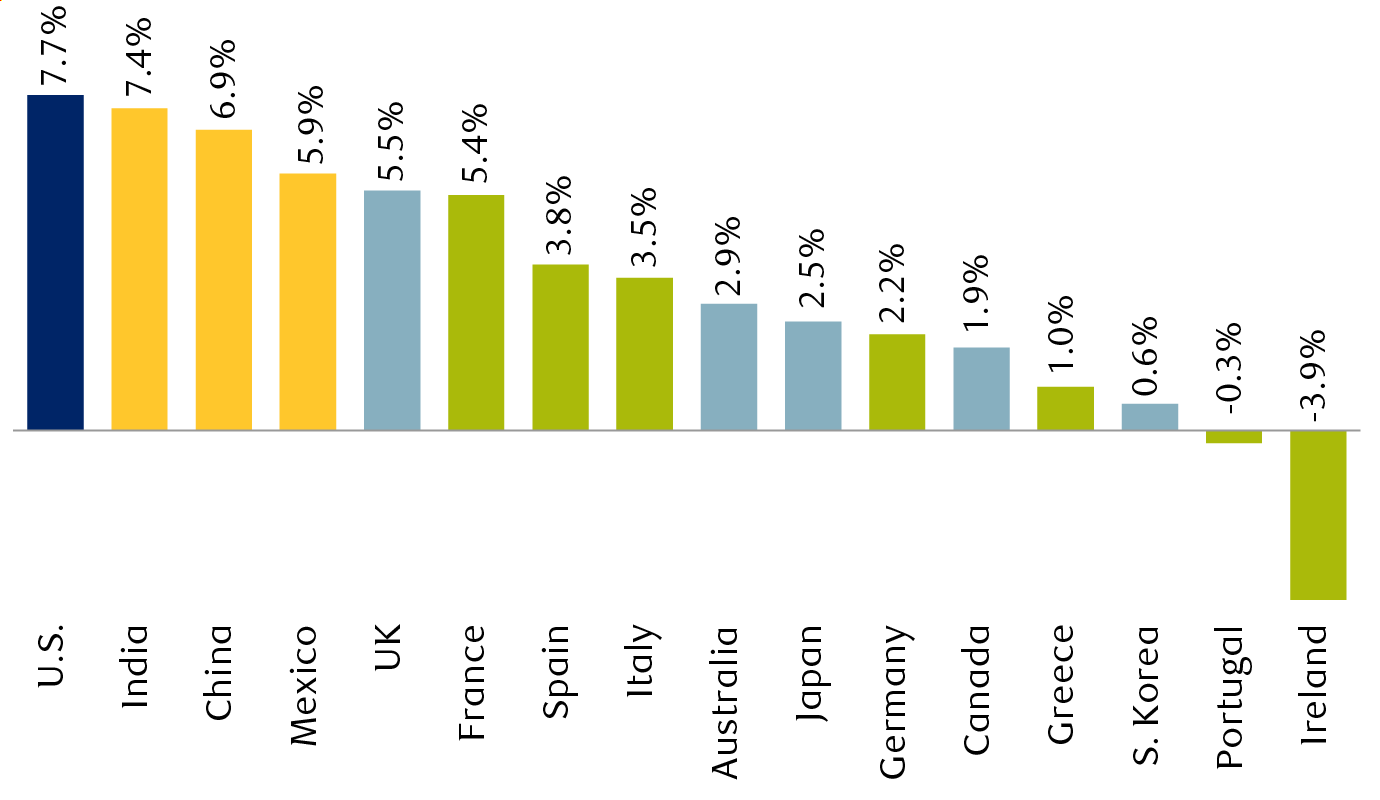 Another reason is the regulatory and taxation environment, which tends to be more friendly to companies in the U.S. The more relaxed regulatory environment allows U.S. companies to be more nimble when cutting costs due to slowing growth. In contrast, non-U.S. companies tend to have higher fixed costs that provide more operating leverage when economic growth accelerates.