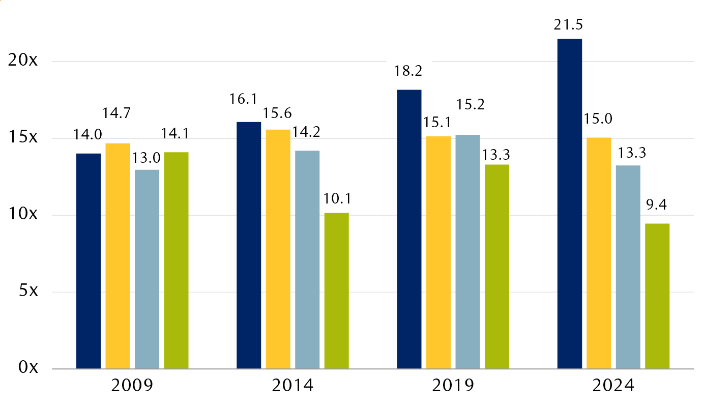 So, there are clear reasons to support a valuation premium in U.S. stocks relative to overseas markets, but we would argue that the pendulum may have swung too far, particularly if the previously stable taxation and regulatory environment becomes more uncertain. While the P/E difference between U.S. and European stocks has typically ranged between one to four points over the last bull cycle, the difference at the end of 2024 was a startling eight points.