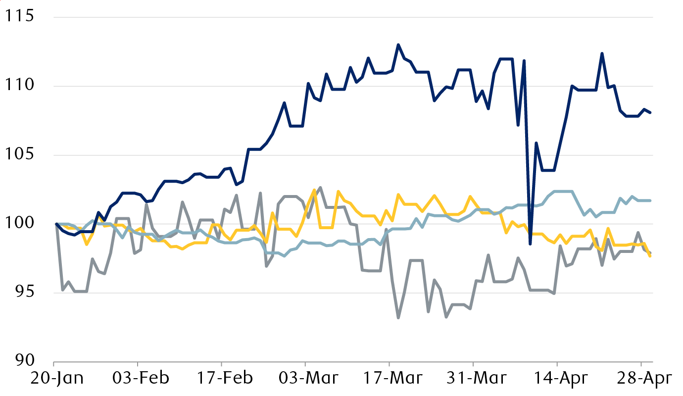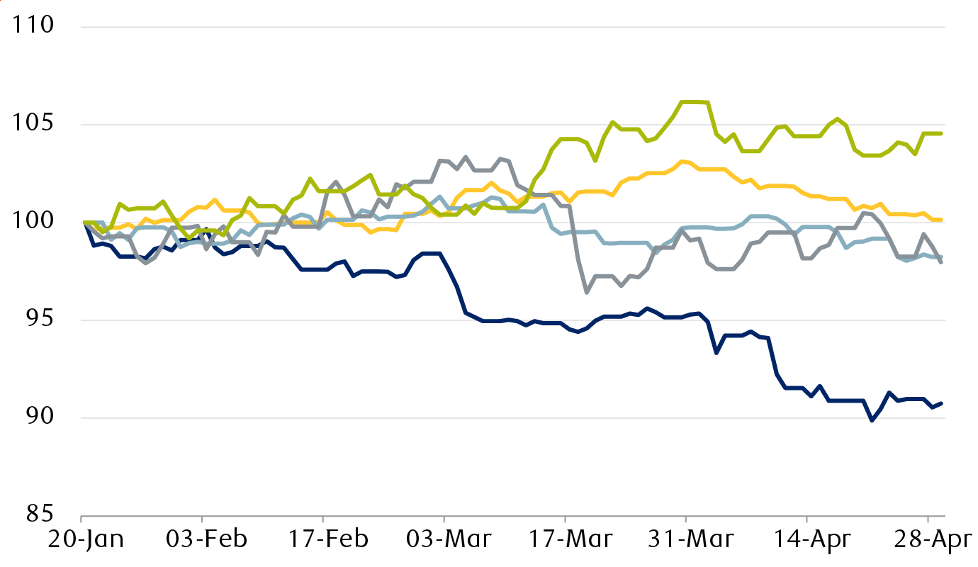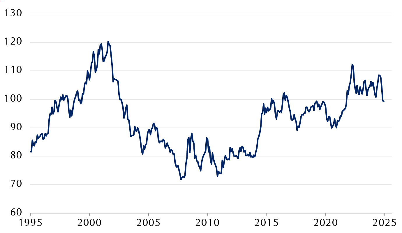 Some of these statements were walked back by his cabinet, but the global rebalancing discussed above, together with a historically overvalued dollar leading into Trump’s second term, kept pressure on the greenback. This period of dollar weakness stands in contrast to the relative stability of the currency during the first few months of previous administrations.