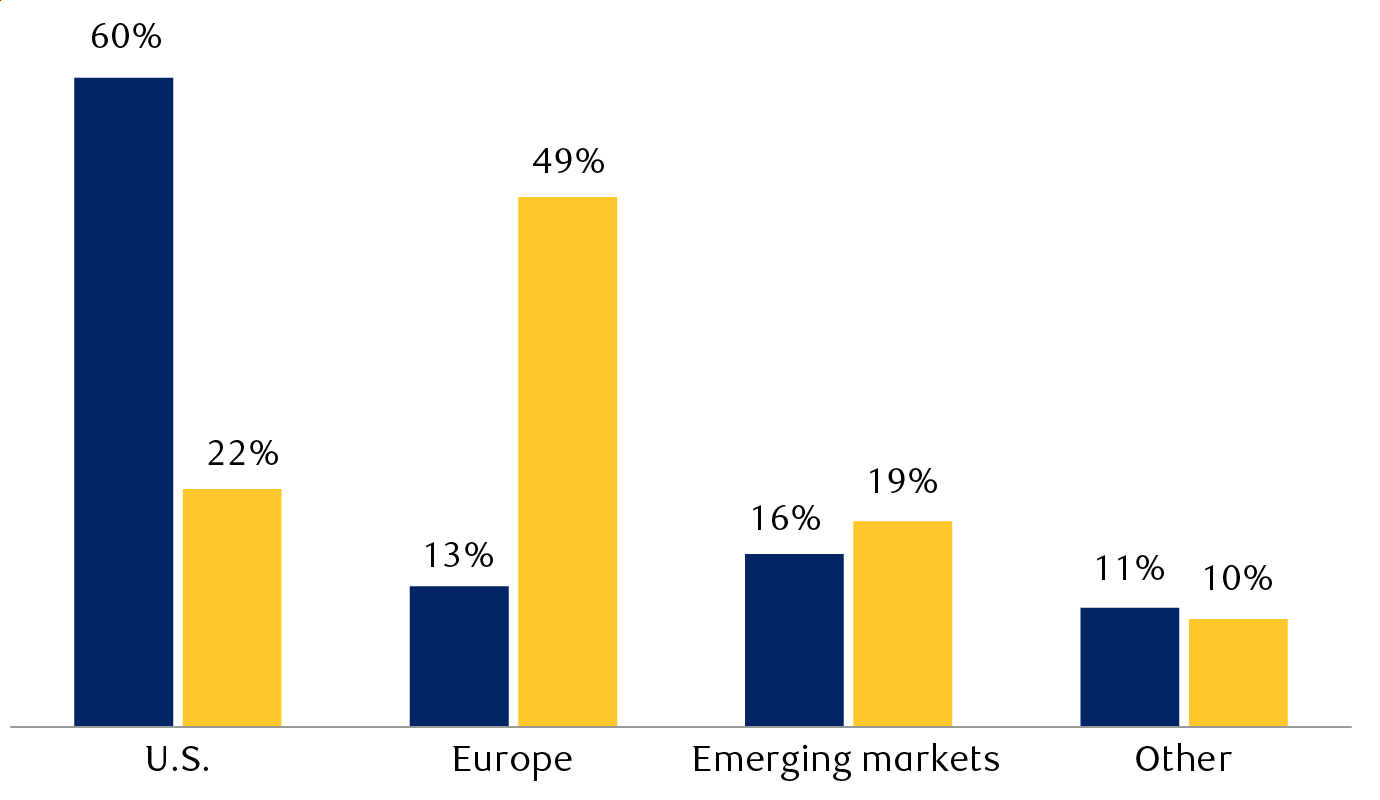 U.S. and European stocks’ revenue exposure by region