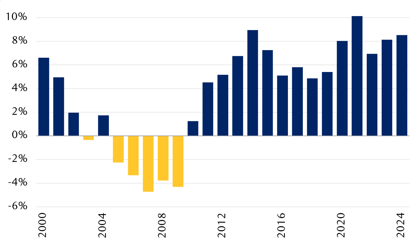 The rally in international stocks relative to their U.S. peers this year has gained a lot of attention. But their recent outperformance is eclipsed by the consistent outperformance of U.S. stocks since 2010. Over that time frame, U.S. stocks’ annual returns beat those of their peers in 13 of the 15 years through 2024, and using a five-year rolling return metric favoured by long-term investors, the U.S. has outperformed consistently over that period.