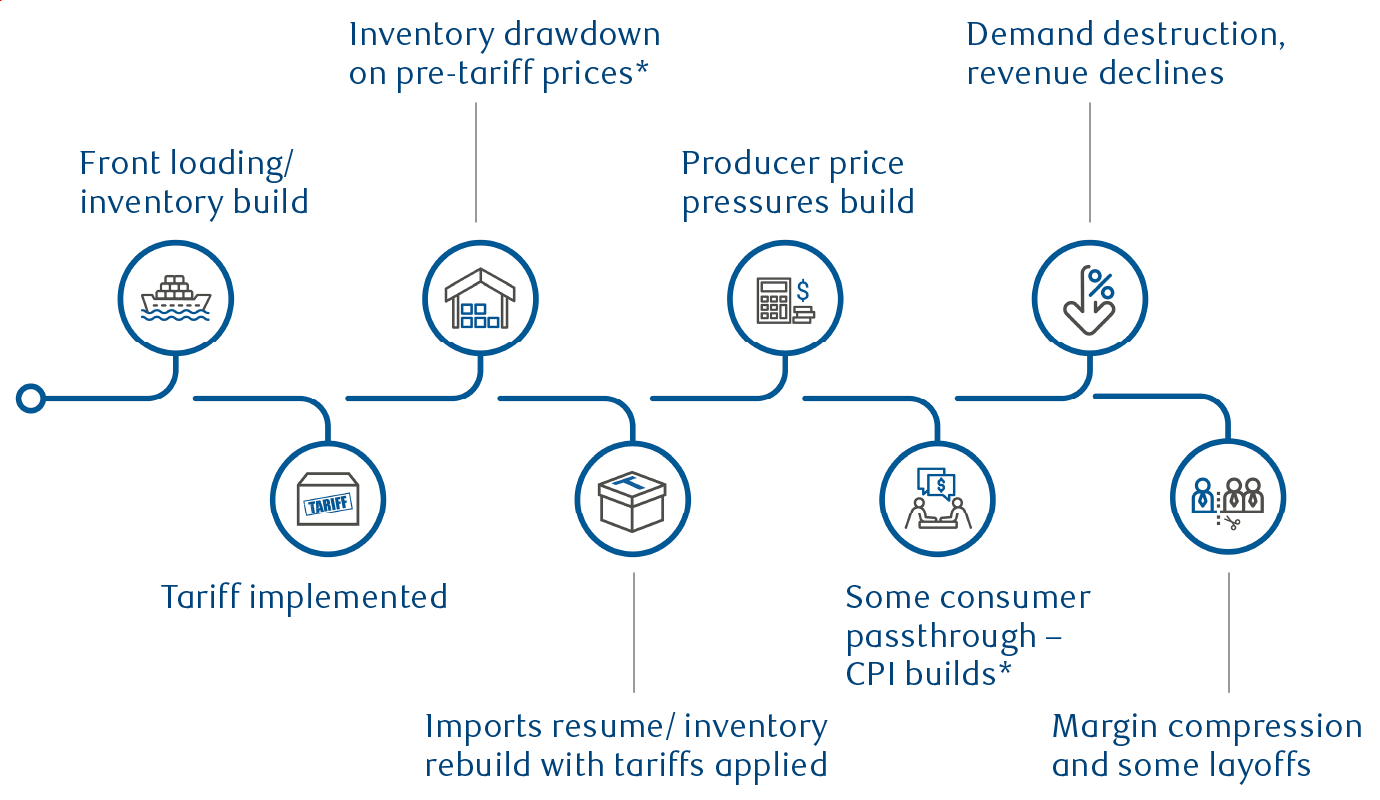 But, when and where those pressures show up will ultimately come down to two core questions: How much inventory has accumulated in the system ahead of the implementation of tariffs, and how much of the cost of tariffs businesses will pass to consumers?