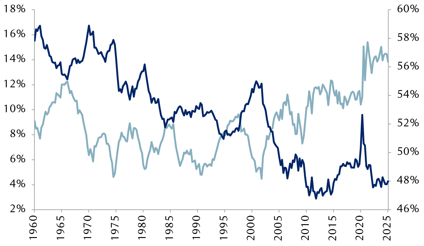 Recent retail sales reports reflect sustained demand for consumer goods, but also signal pre-tariff front-loading by consumers as well (notably in autos). That could imply that recent consumer demand won’t be sustained. Importantly, we continue to expect high-income consumers will dominate consumption activity and have much higher levels of resilience.